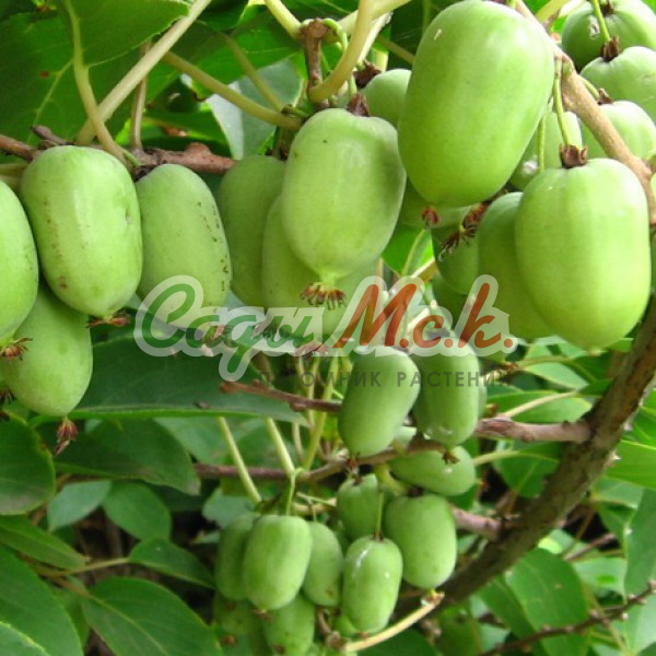 Красивое растение-лиана высотой около 7 метров с некрупными оливково-зелеными неопушенными листьями. Побеги средней длины, зеленые так же неопушенные, вьющиеся, не имеют шипов. Актинидия Вафельная уживается в соседстве с растениями крупномерами. Для сорта характерны средние сроки созревания плодов. Ягоды сильно удлиненные эллиптической формы весом до 3- 3,5 г. Цвет может различаться от нежно-оливкового до оливкового насыщенного в зависимости от места произрастания и степени затененности участка. Вкус сладкий. С одного куста за лето собирают около 0,8 кг ягод. Растение морозостойкое, нуждается в опылении мужскими растениями