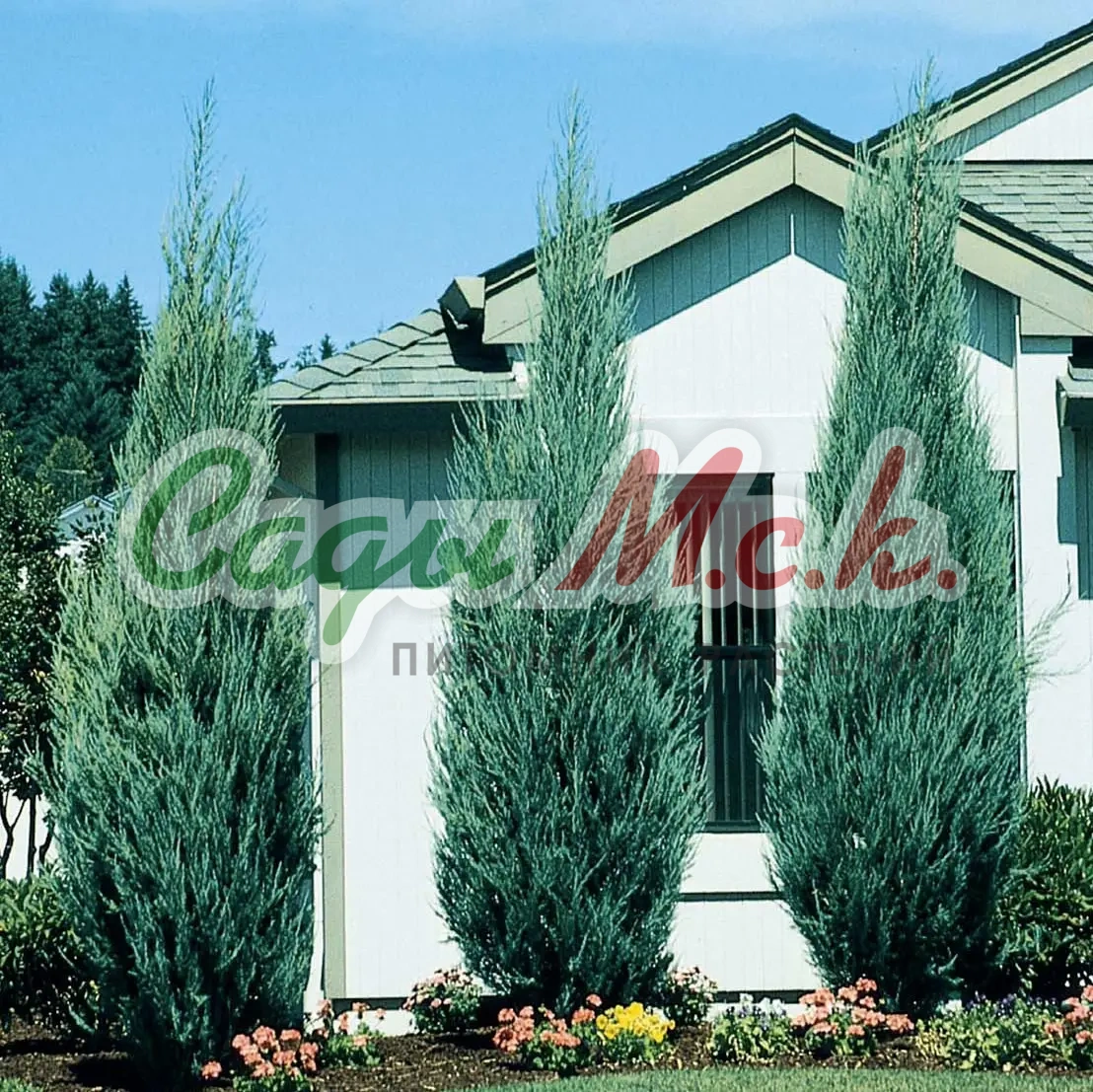 Можжевельник скальный Блю Арроу - высокий хвойный кустарник с очень узкой, колоновидной кроной. Жесткие, вертикально растущие, плотно прижатые к стволу побеги, прирастают примерно 15 см в год. В 10-летнем возрасте растение достигает 2-2,5 м в высоту и 0,5-0,7 м в диаметре