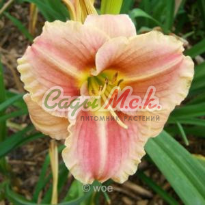 Лилейник гибридный Дан Махони (Hemerocallis) — один из наиболее подходящий сортов для ценителей спокойных оттенков. Он цветет с июля, и в течение нескольких недель на нем образуются крупные воздушные цветы до 12 см в диаметре. Их лепестки нежные, волнистые, гофрированные, светло-розовые с переходом в лососевый на кайме и около сердцевины. Центр выделяется — он желтый, здесь также находятся золотистые тычинки.
