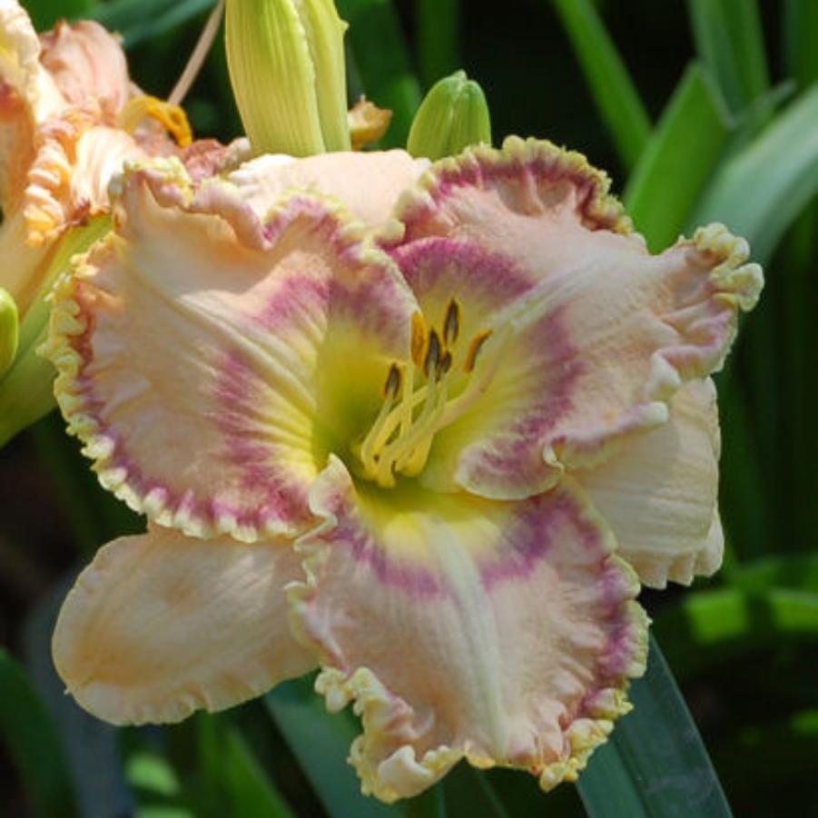 Саженцы лилейника Sink Into Your Eyes — великолепный сорт с розово-кремовыми цветками, с золотистым центром и темно-фиолетовой каймой. Сорт отличается интенсивностью цвета и возможностью повторного цветения. Используется для украшения клумб, рабаток, в одиночных и групповых посадках. Крупномер Sink Into Your Eyes в диаметре достигает 14 см, зацветает в конце июля и в августе. Высота растения — 70 см. Повторноцветущий тетраплоид. Окраска цветка — розово-кремовая, с темно-фиолетовой яркой каймой и золотистой сердцевиной.Требование к освещенности — любит солнце, но переносит и полутень. Требование к почве — любые, особых требований к почве не предъявляет. Требования к поливу — не любит частых поливов.