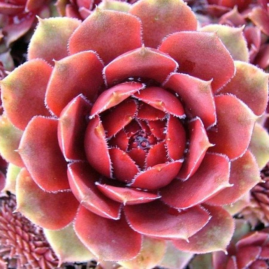 Молодило Sha Uri - весьма необычный многолетник. Розетки средних размеров. Их окрас - двуцветный: зеленый ближе к основанию и пурпуный по центру листьев. Кайма листьев зеленая. Сорт отличается белым налетом в центре розетки.